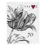 Jeanne Greco designed the Vintage Tulip stamp using drawings from engraved plates made by Maria Sibylla Merian (1647-1717), a naturalist artist.? Greco added a small, dark red heart for a touch of color.? This stamp was printed using engraving, unlike most modern stamps that are lithographed.