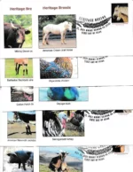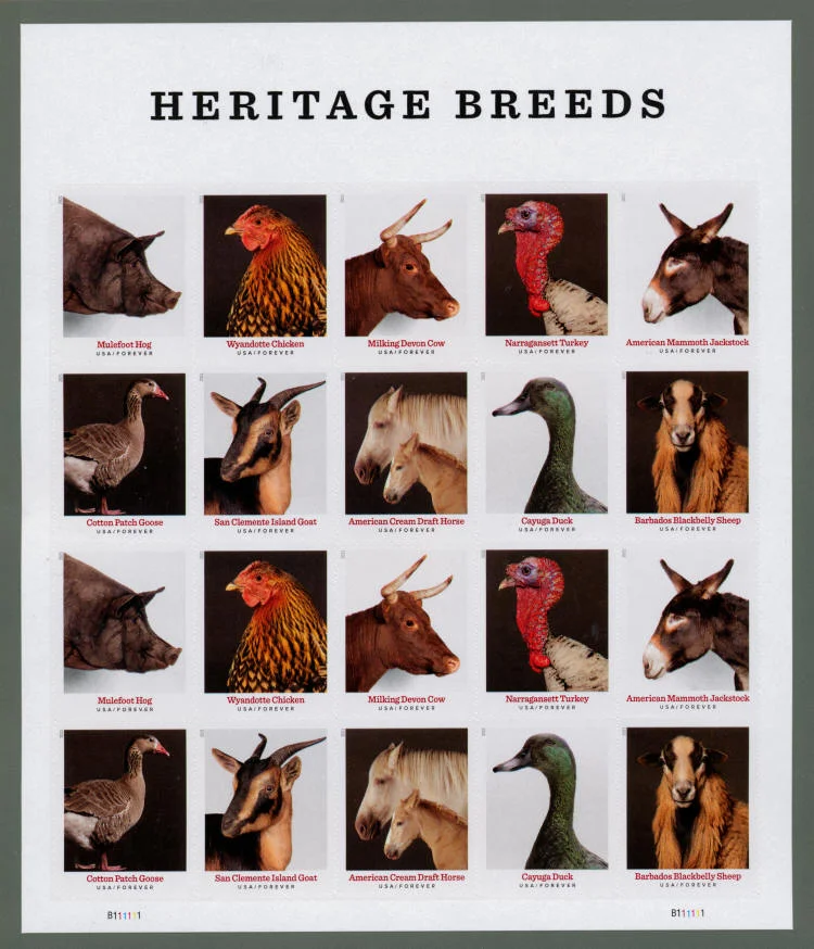 The pane of 20 Stamps includes photographs of 10 heritage breeds: the Mulefoot hog, the Wyandotte chicken, the Milking Devon cow, the Narragansett turkey, the American Mammoth Jackstock donkey, (second row) the Cotton Patch goose, the San Clemente Island goat, the American Cream draft horse, the Cayuga duck and the Barbados Blackbelly sheep.