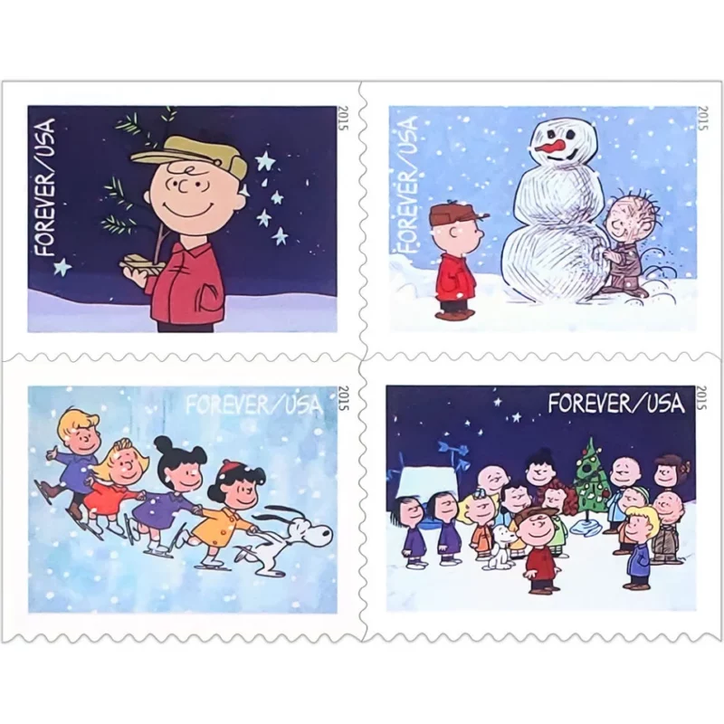 Each of the Charlie Brown Christmas Stamps features a still taken from?A Charlie Brown Christmas.??Art director Antonio Alcal?? designed the Stamps.