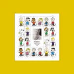 Designs: Feature 10 PEANUTS characters from Schulz’s existing artwork, with a central pane displaying a 1987 black-and-white photo of Schulz.