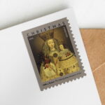This Christmas stamp features a detail of the painting Our Lady of Gu??pulo. Painted in the 18th century by an unknown artist in Cuzco, Peru, Our Lady of Gu??pulo is from the collection of The Metropolitan Museum of Art in New York. Enrobed in a pyramidal gown speckled with jewels and holding a scepter woven with roses and leaves, a crowned Virgin Mary looks down at a similarly adorned Christ Child in her left arm.