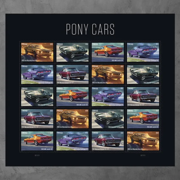 These Stamps celebrate five iconic U.S. automobiles??the 1969 Ford Mustang Boss 302, the 1970 Dodge Challenger R/T, the 1969 Chevrolet Camaro Z/28, the 1967 Mercury Cougar XR-7 GT, and the 1969 AMC Javelin SST. Painted using oil paint on panels, the stamp artwork, with bold colors and dramatic light, captures the energy and mystique of pony cars.