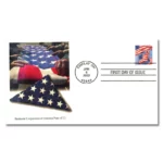 The stamp art is a painting of three flags in a circular formation, reminiscent of the 50 flags encircling the Washington Monument. The artist used three separate photographs of the same flag taken seconds apart as reference and stitched together the images into a single composition. Laura Stutzman was the stamp designer and illustrator.