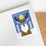 Each stamp actively features a different woodland animal – deer, fox, rabbit, and owl, in their wintery habitats. Katie Kirk illustrated the art.